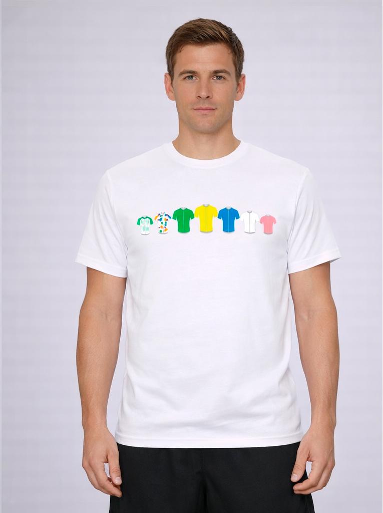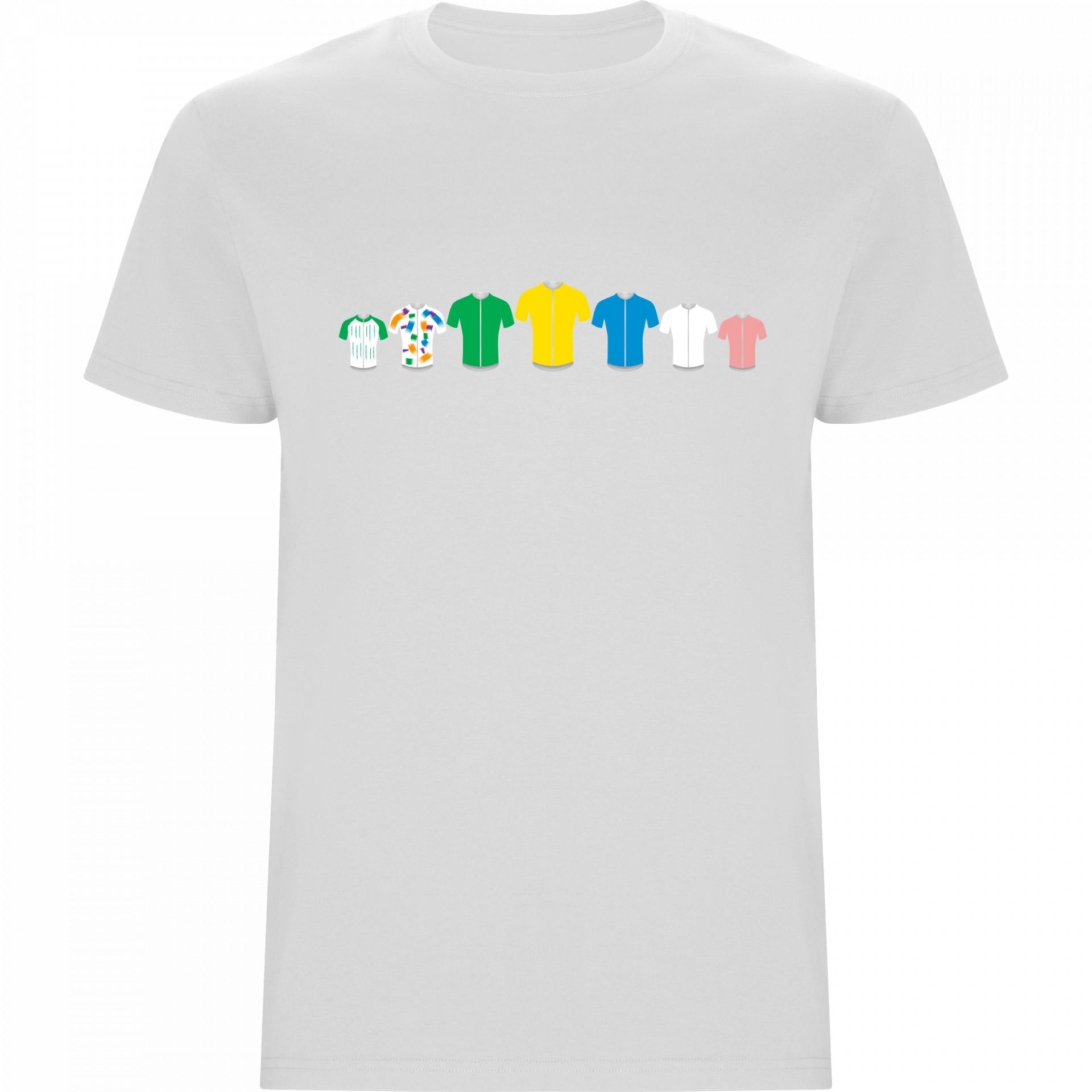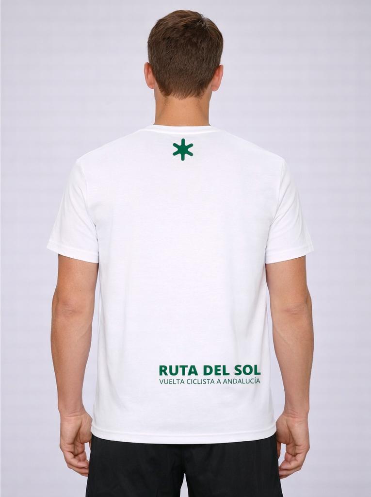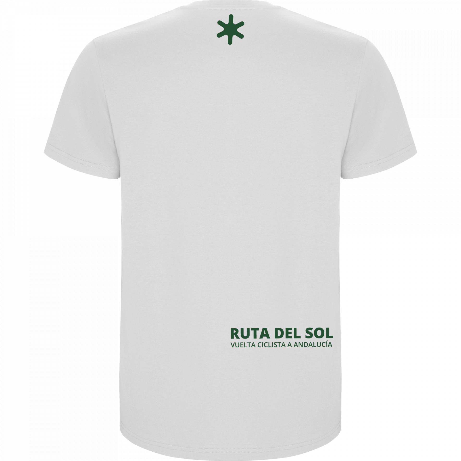 Esta camiseta blanca 100% algodón rinde homenaje a los maillots de líderes de la Ruta del Sol mediante una estampación limpia y visual que representa los colores que identifican la competición.