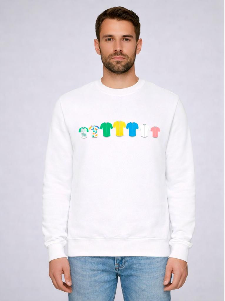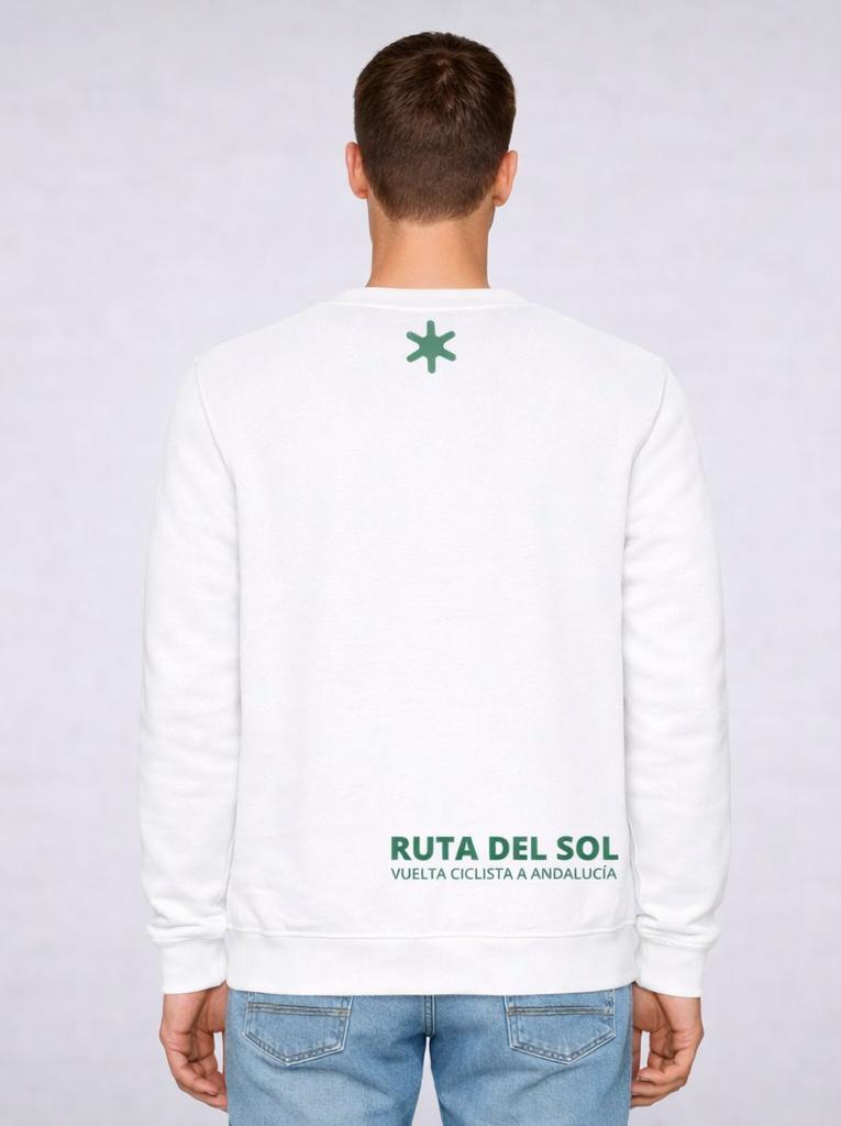 Esta sudadera verde de adulto rinde homenaje a los maillots de líderes de la Ruta del Sol mediante una estampación limpia y muy visual que representa los colores que identifican la competición.
